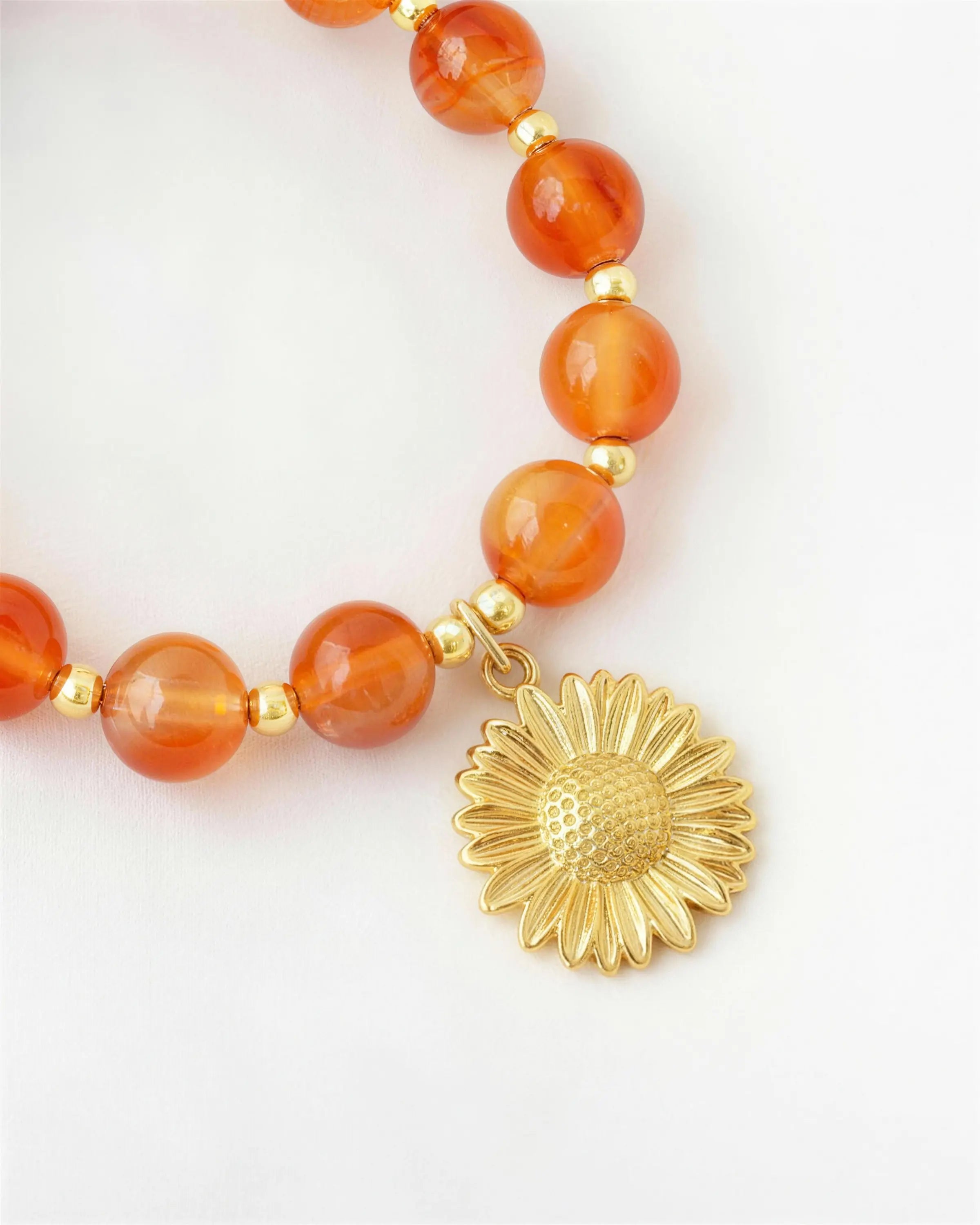 A catalyst for your brightest ideas. Like a slice of golden hour you can wear, these 10mm Orange Agate beads glow with a honey-like warmth against your skin. Anchored by the cheerful gold sunflower pendant, this necklace radiates optimism, encouraging you to express yourself boldly—whether you are presenting a new concept or simply laughing over brunch in a sun-drenched café.