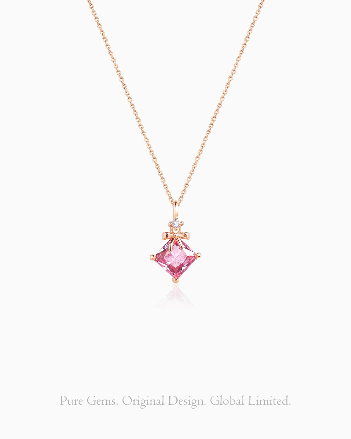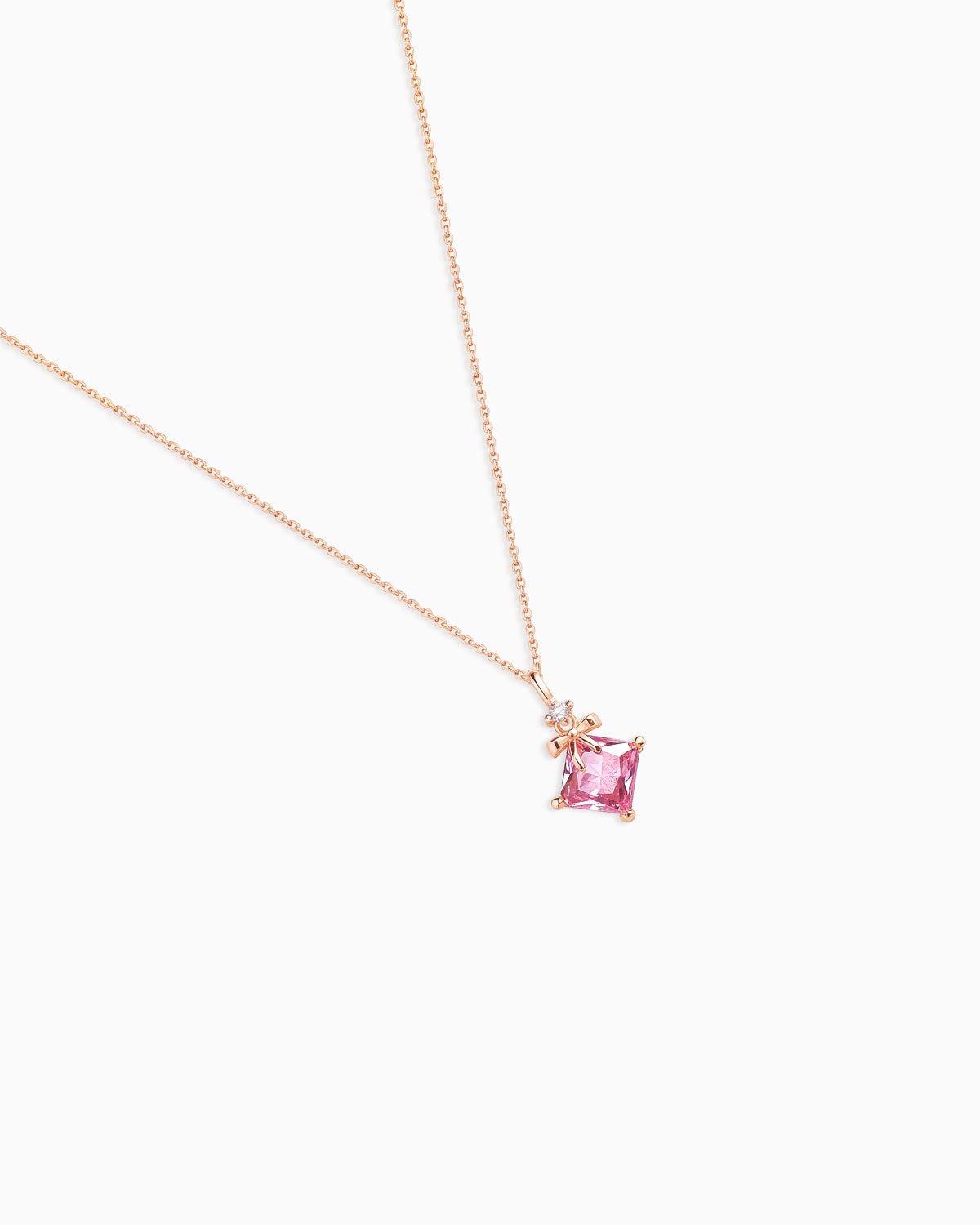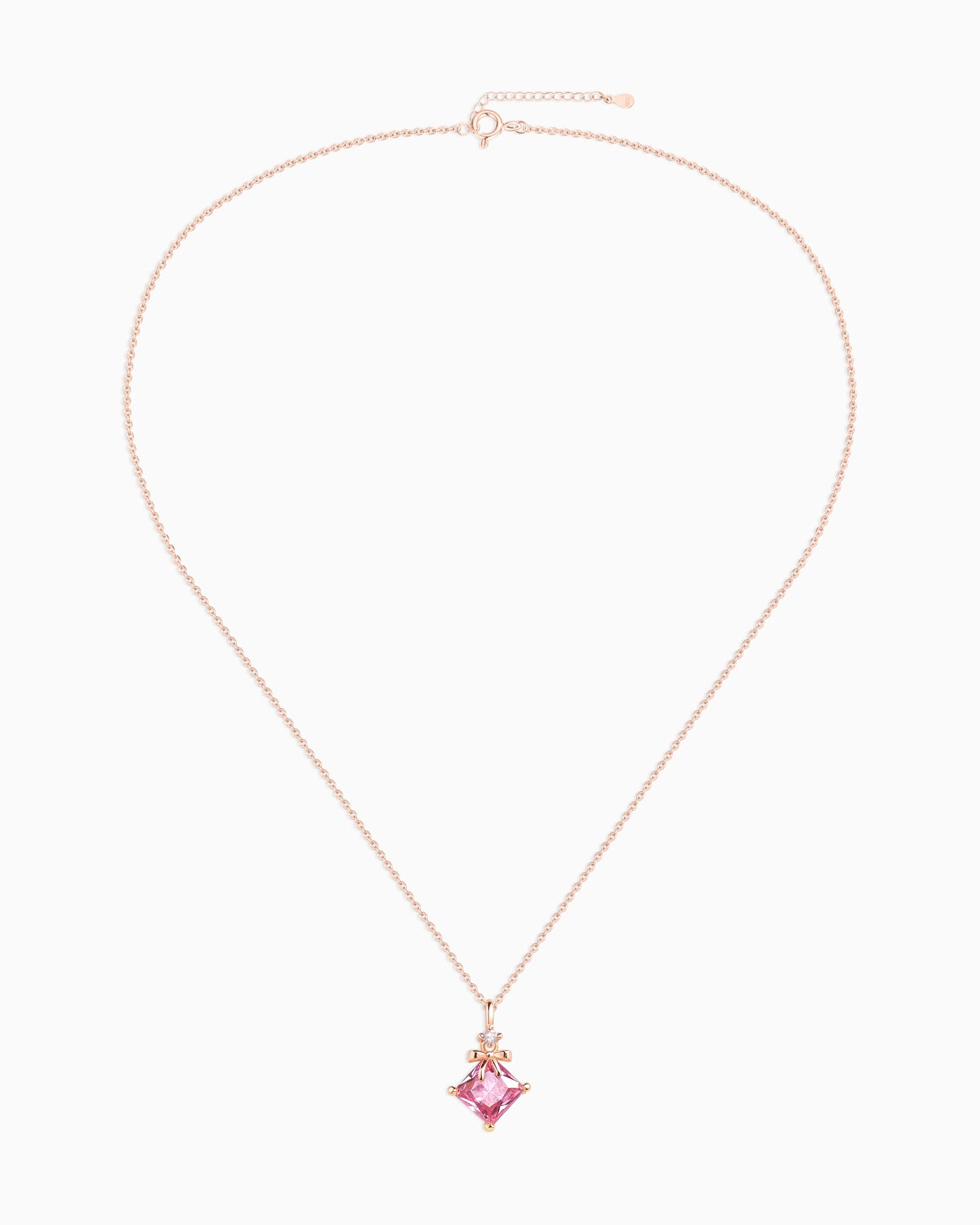 This pink crystal pendant is diamond-shaped and adorned with a delicate bow on top.
