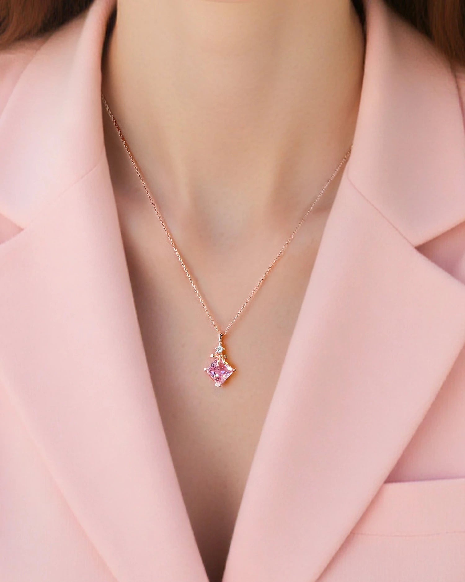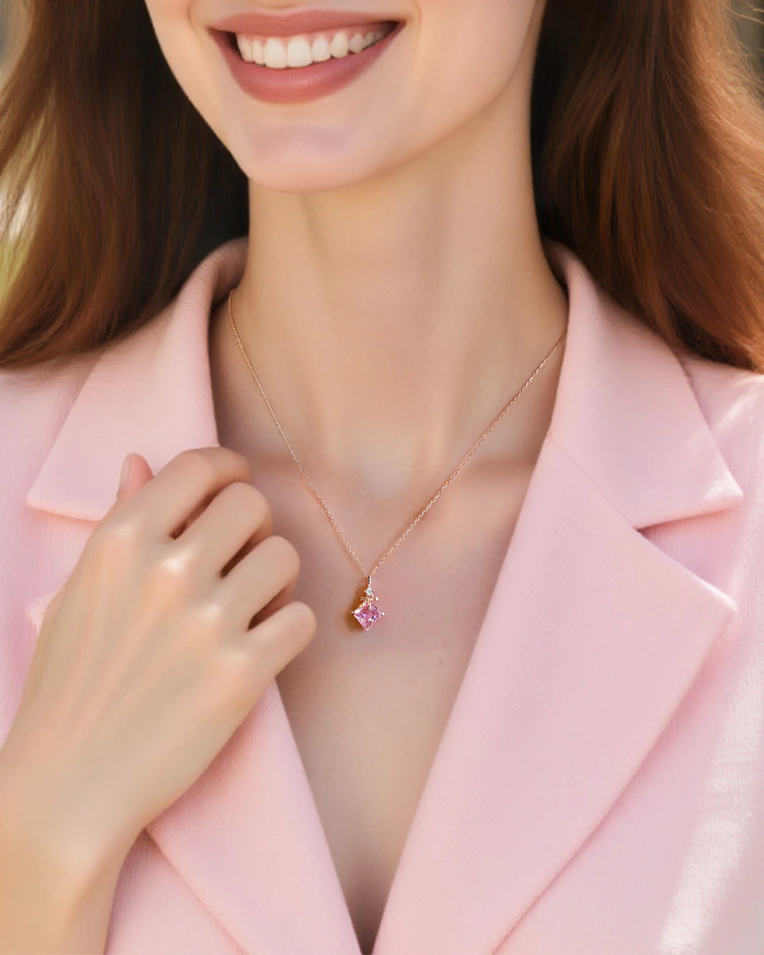 Suspended from a 14K gold-plated sterling silver chain, its soft pink hue evokes love and grace—an elegant piece for everyday wear or special occasions.