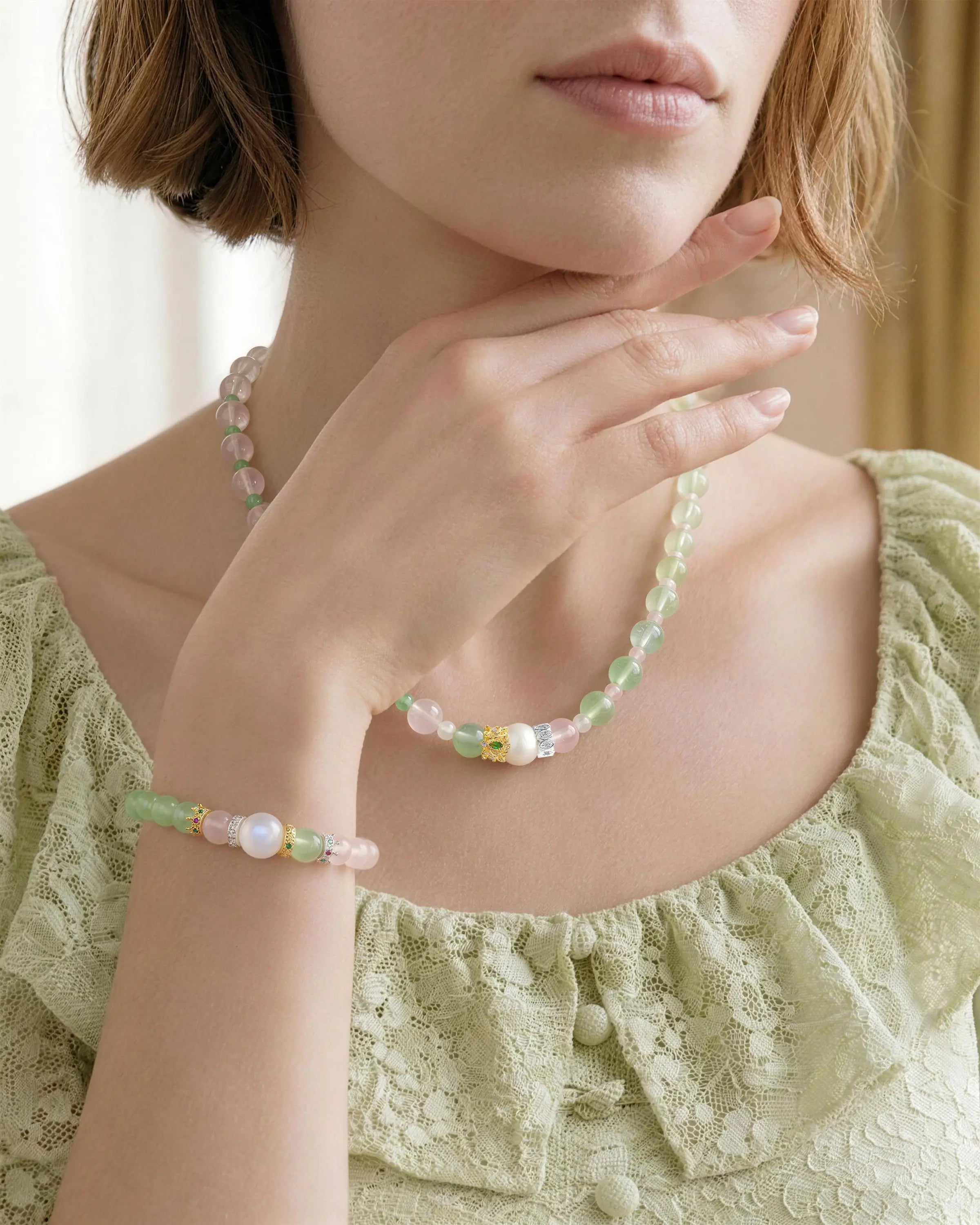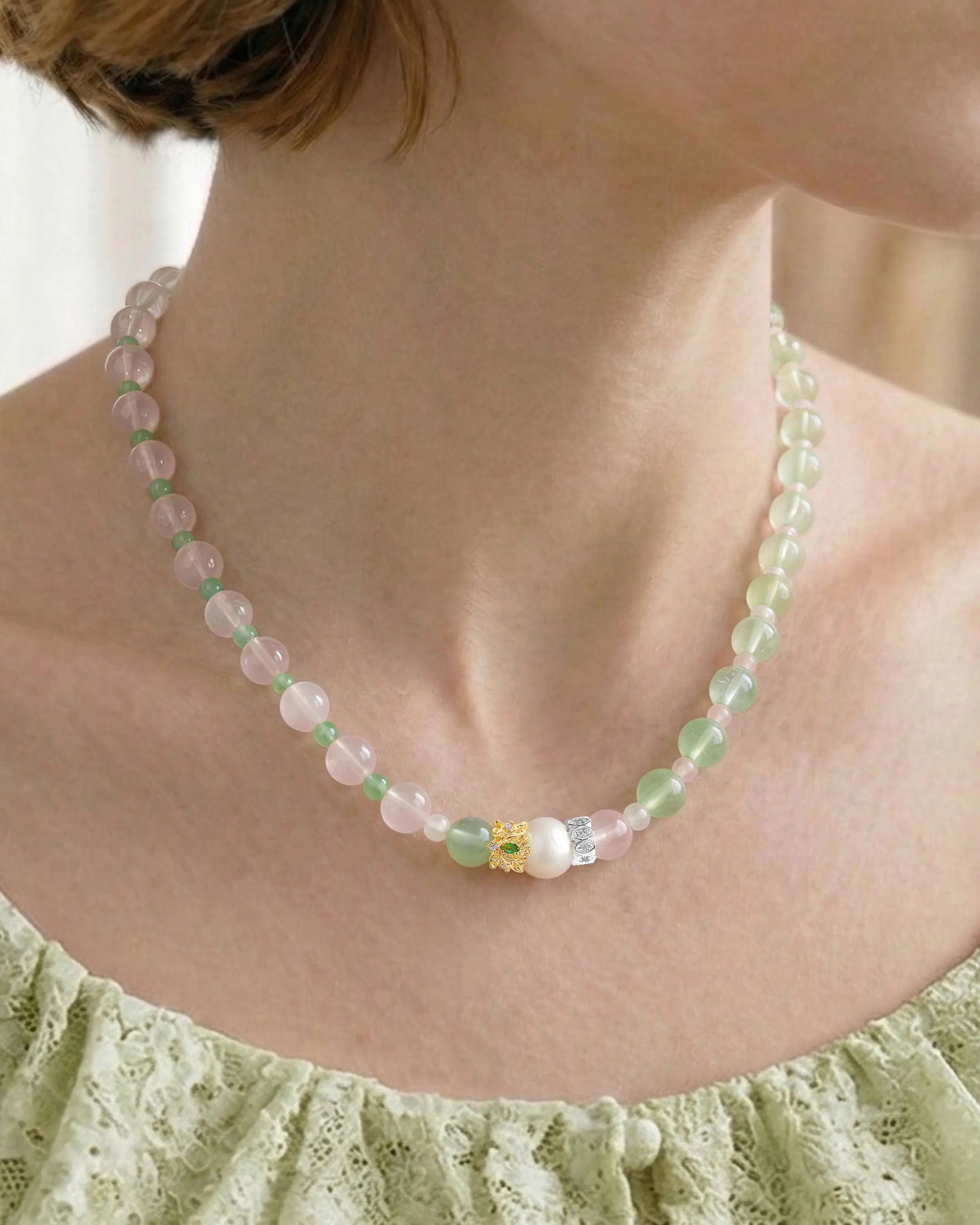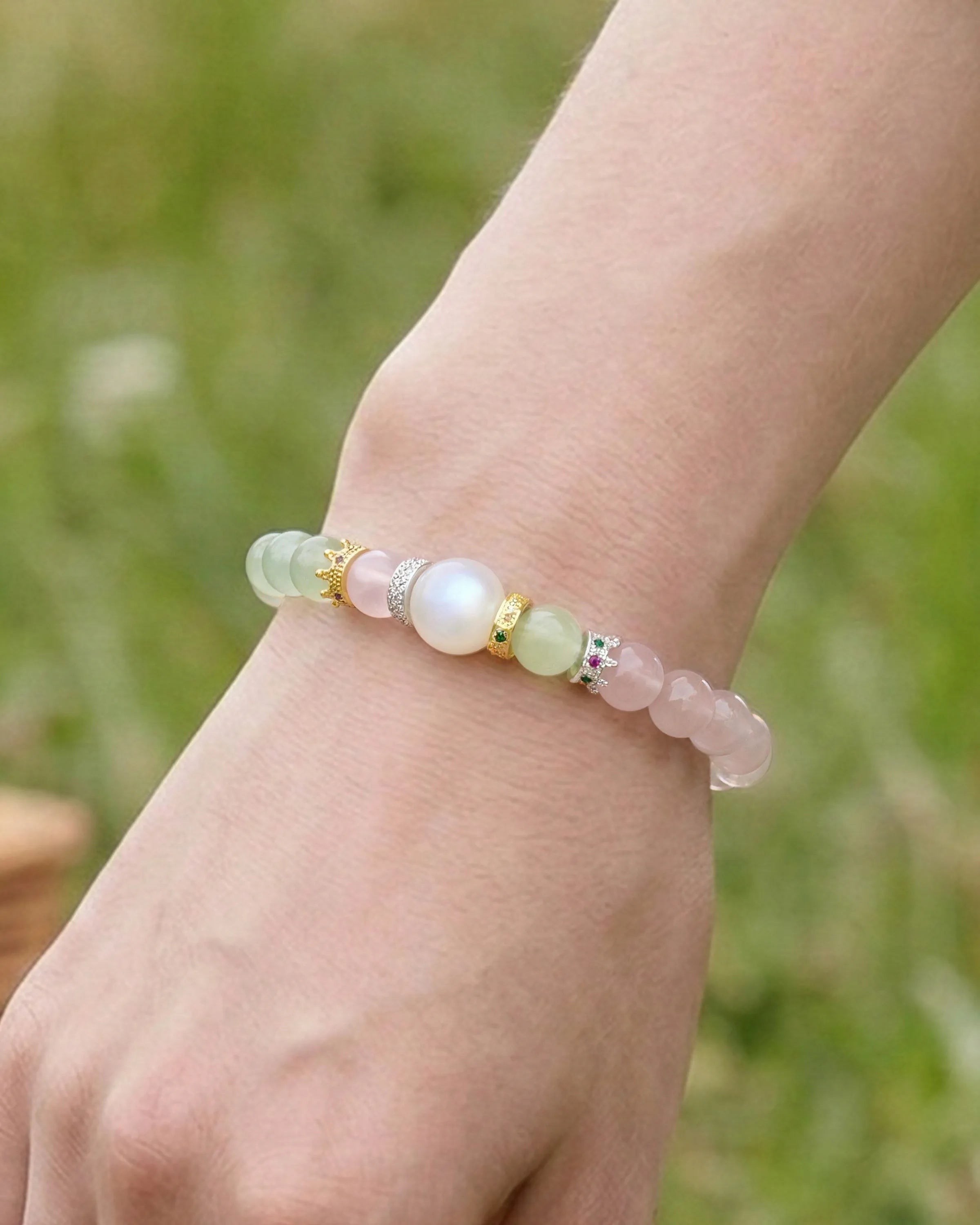 Prehnite, Aventurine, Rose Quartz, Moonstone, Clear Quartz, and Pearl