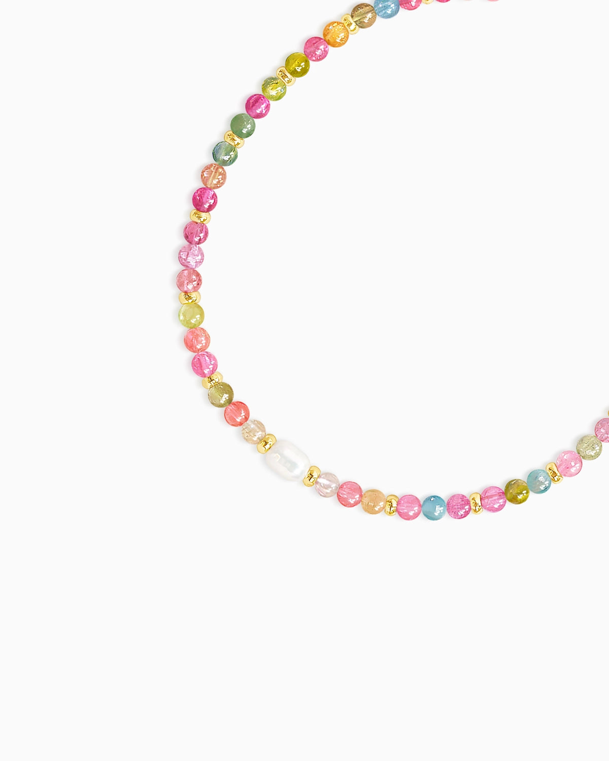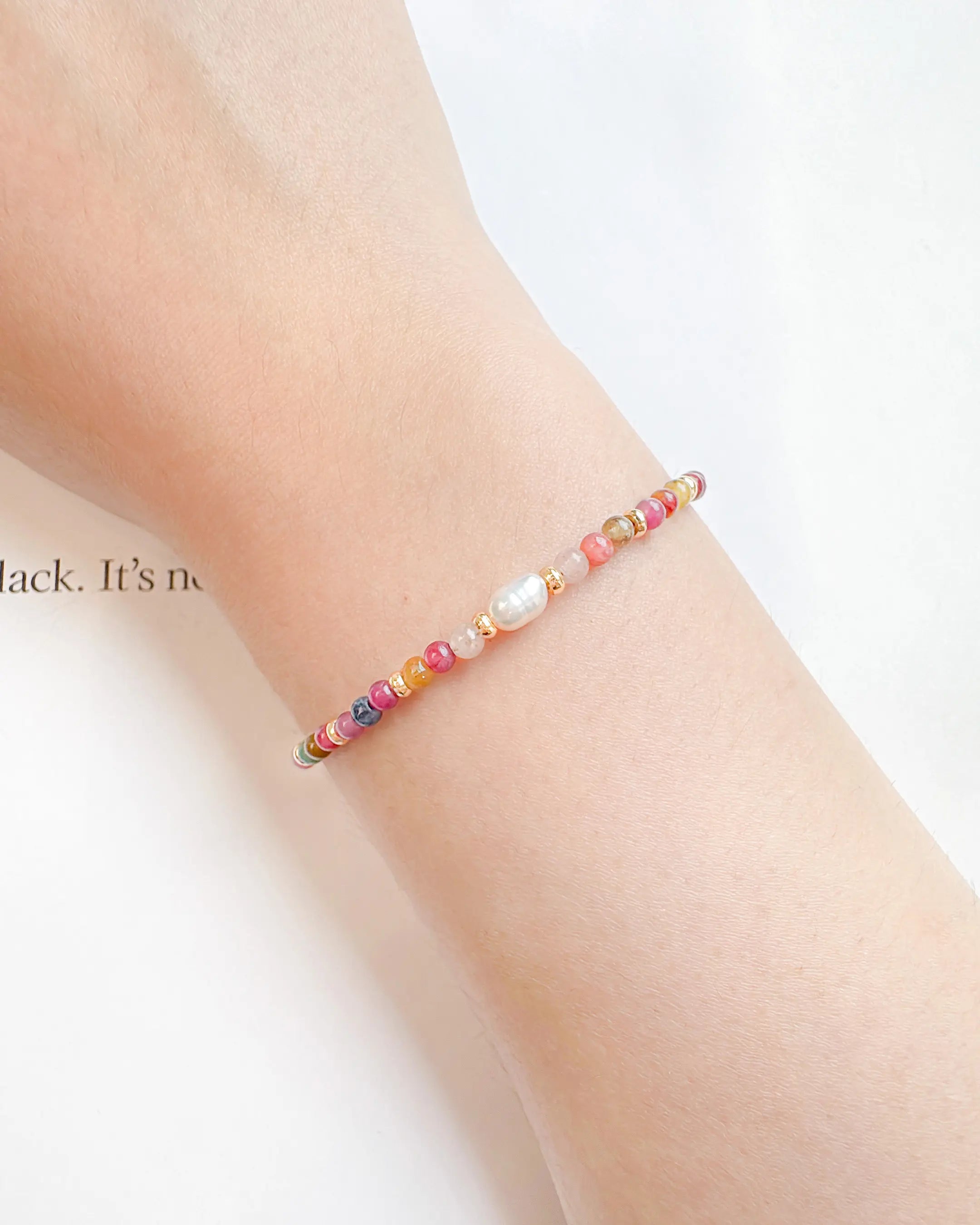 Inspired by the gentle flow of natural colors, this bracelet strings together a vibrant spectrum of natural 3mm rainbow tourmaline beads, softly highlighted with baroque pearls and 14K gold-plated details.