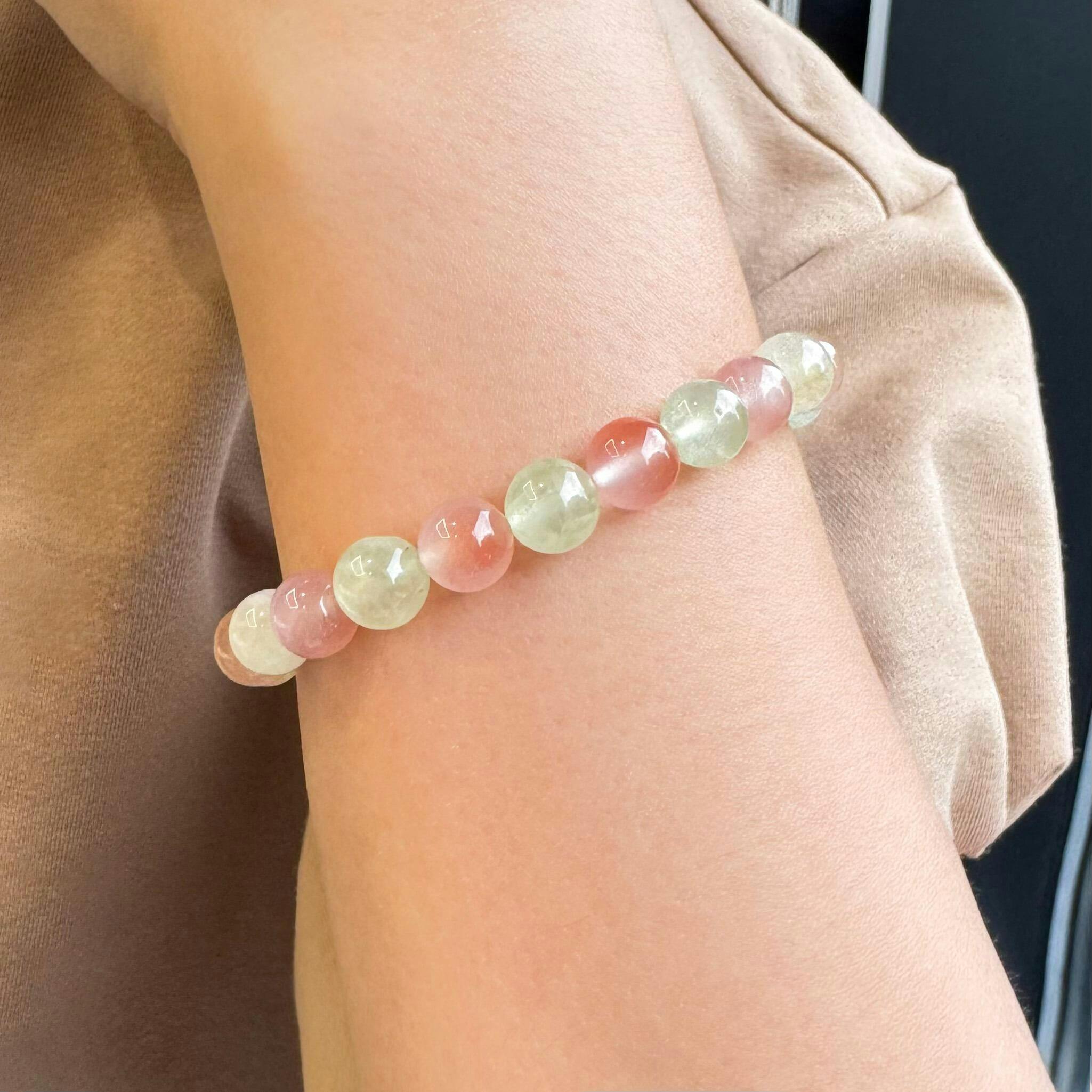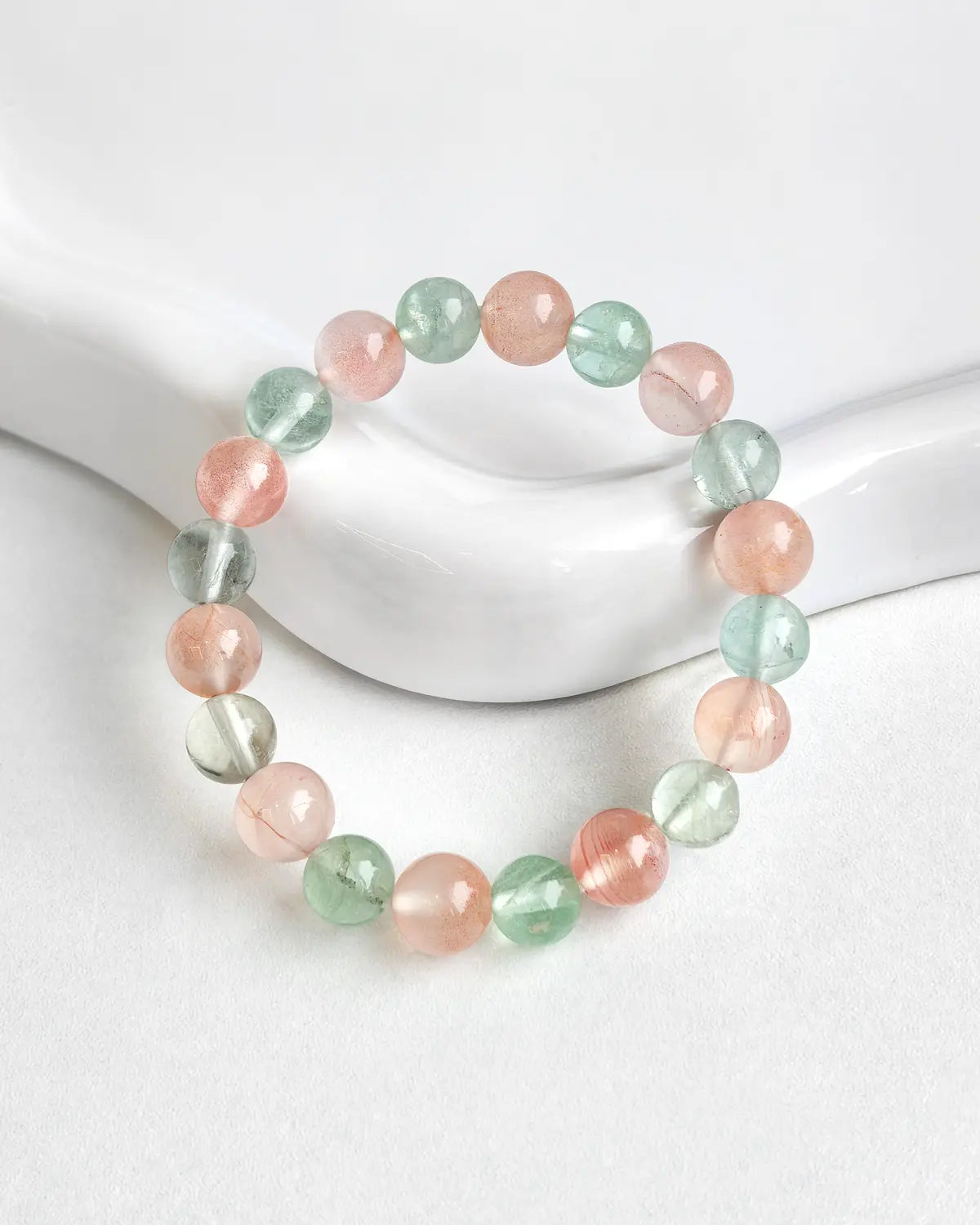 Inspired by a spring picnic in the meadow, this bracelet pairs soft green prehnite with red agate, blending cool clarity with warm strength.