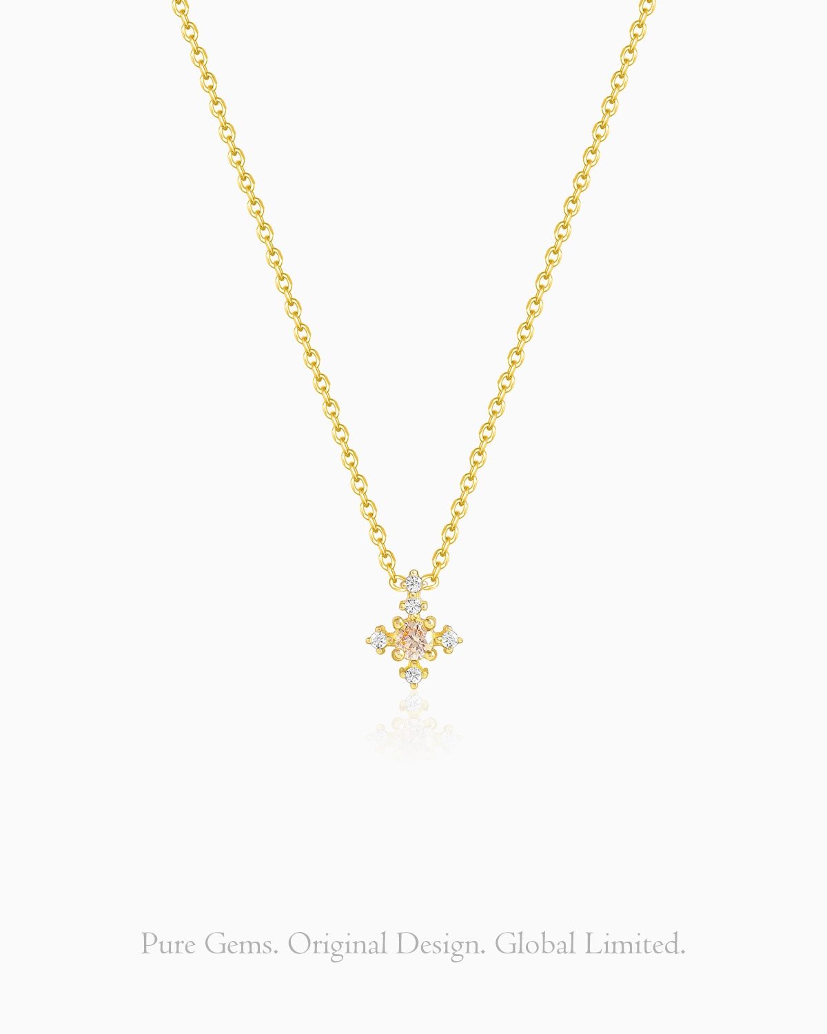 At its heart lies a blush-pink stone inspired by rose quartz, framed by shimmering white crystals in a snowflake silhouette.