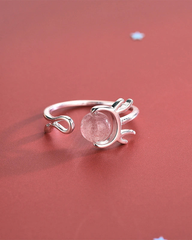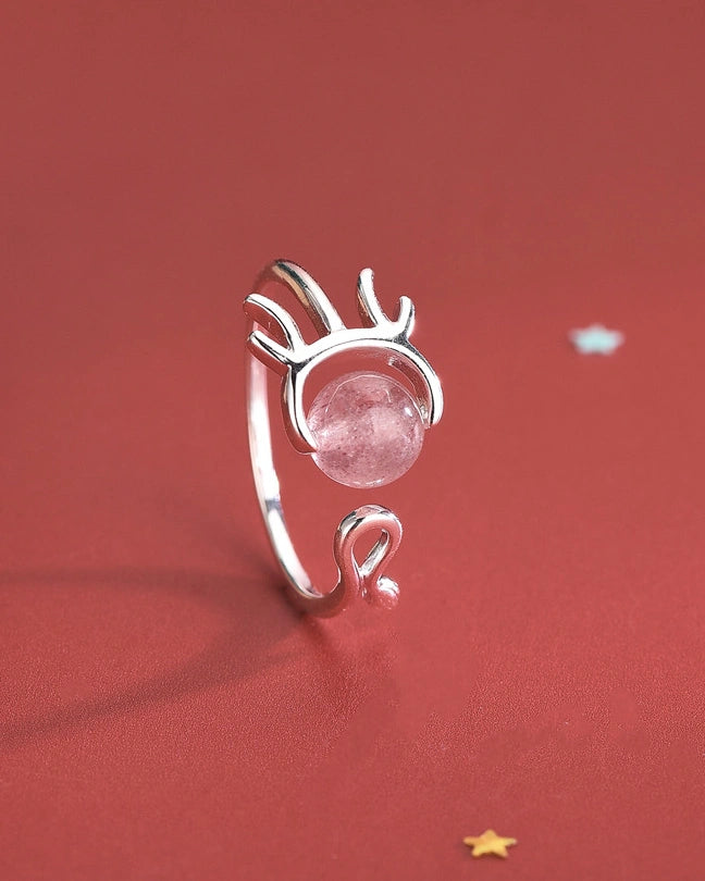 A graceful reindeer silhouette frames the soft pink cabochon, capturing the magic of winter light and festive elegance while keeping a minimalist, modern feel.