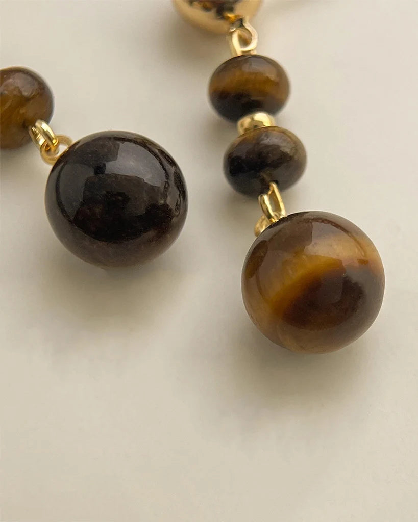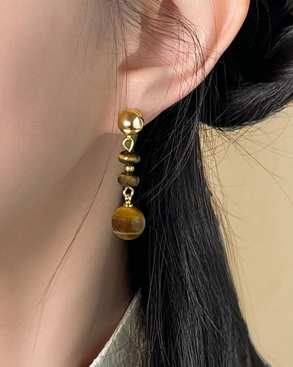 These Tiger’s Eye Pendant Earrings feature two smooth oval stones and a single round gem that shimmers with warm golden light.