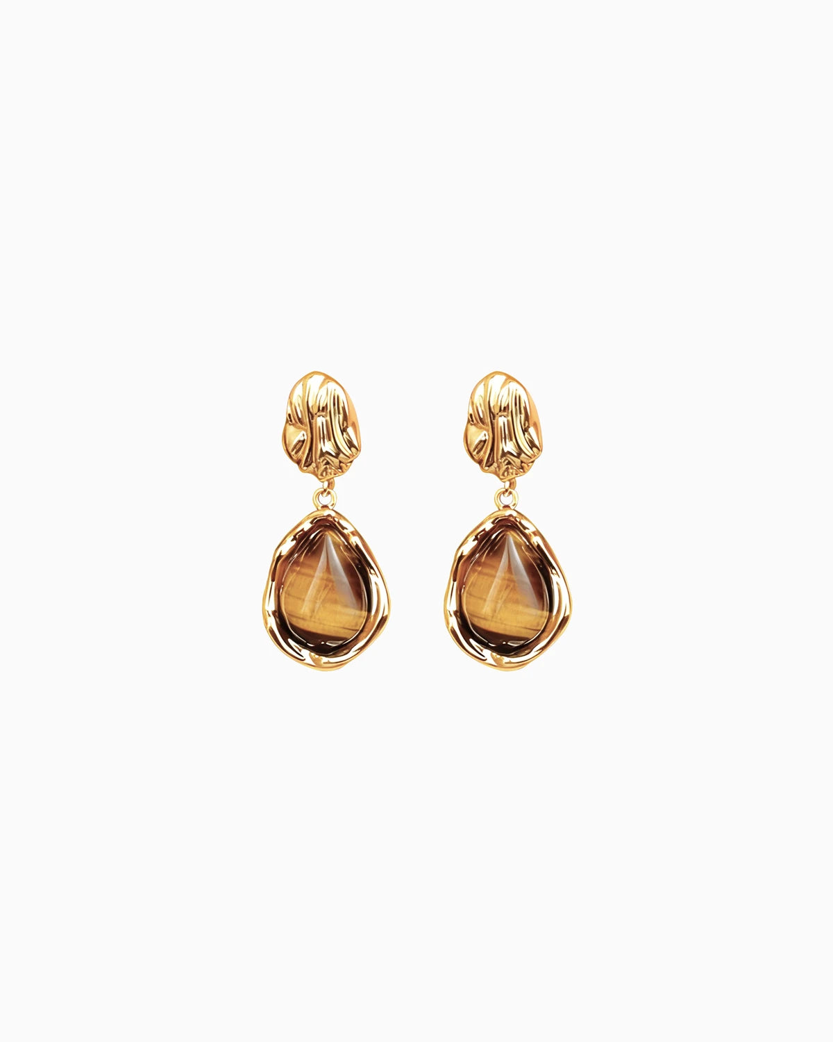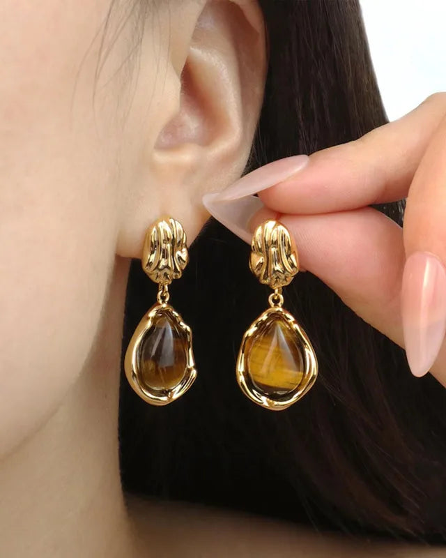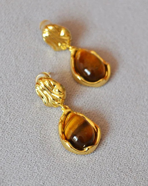 Inspired by the natural flow of light, these Tiger’s Eye Irregular Oval Drop Earrings feature smooth, asymmetrical teardrop stones that catch the glow from every angle.