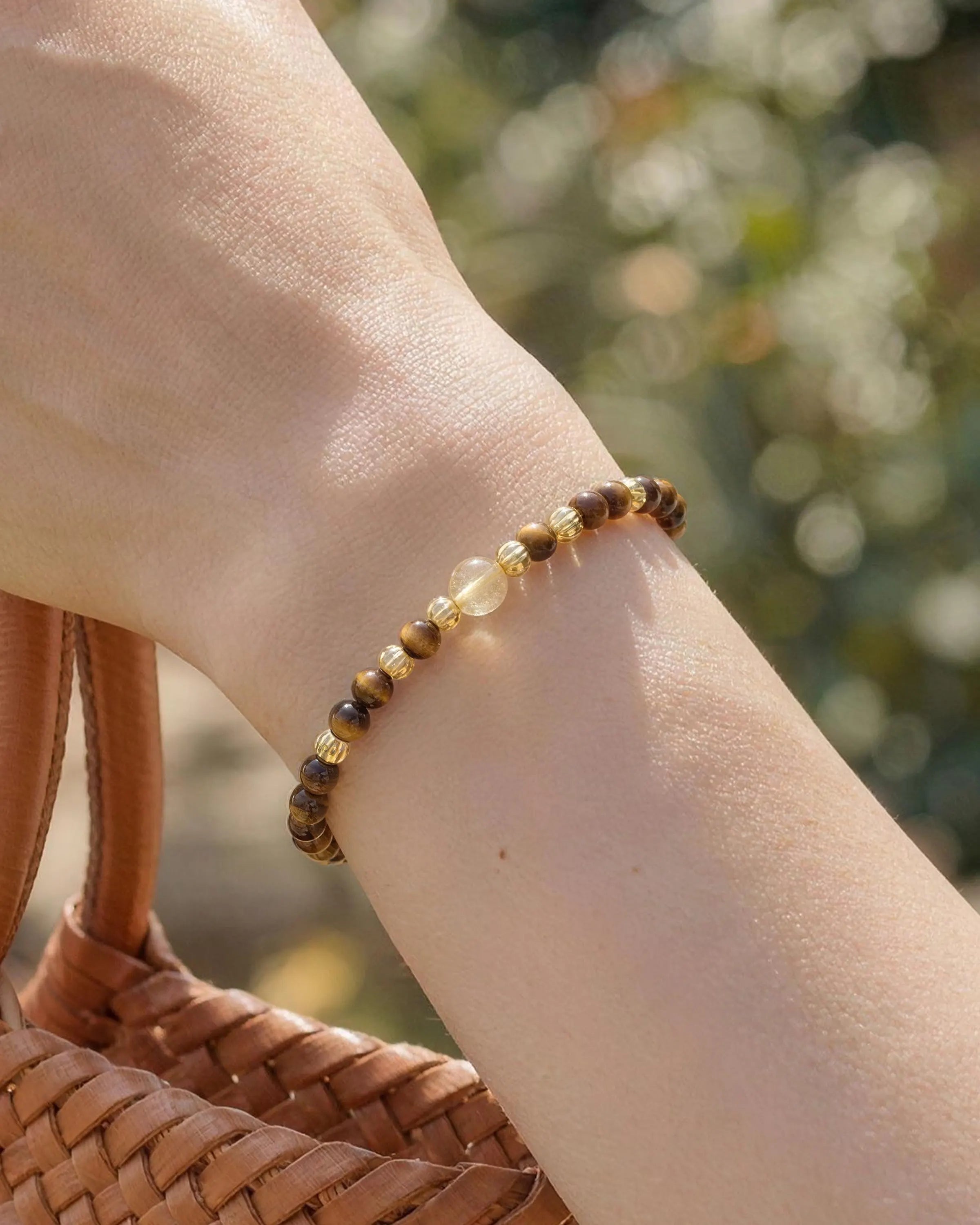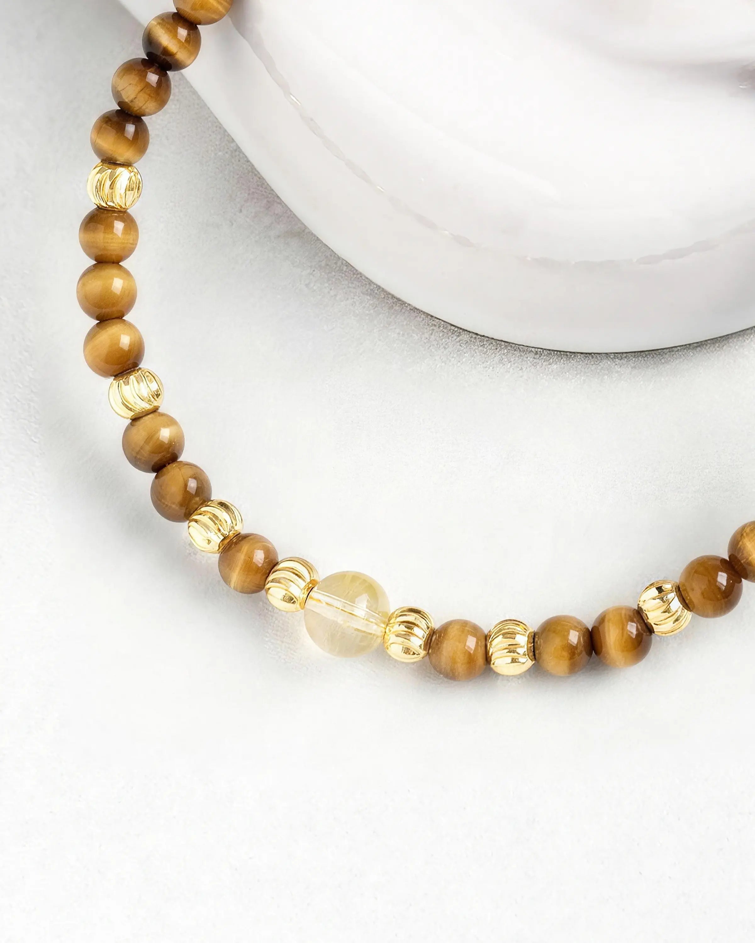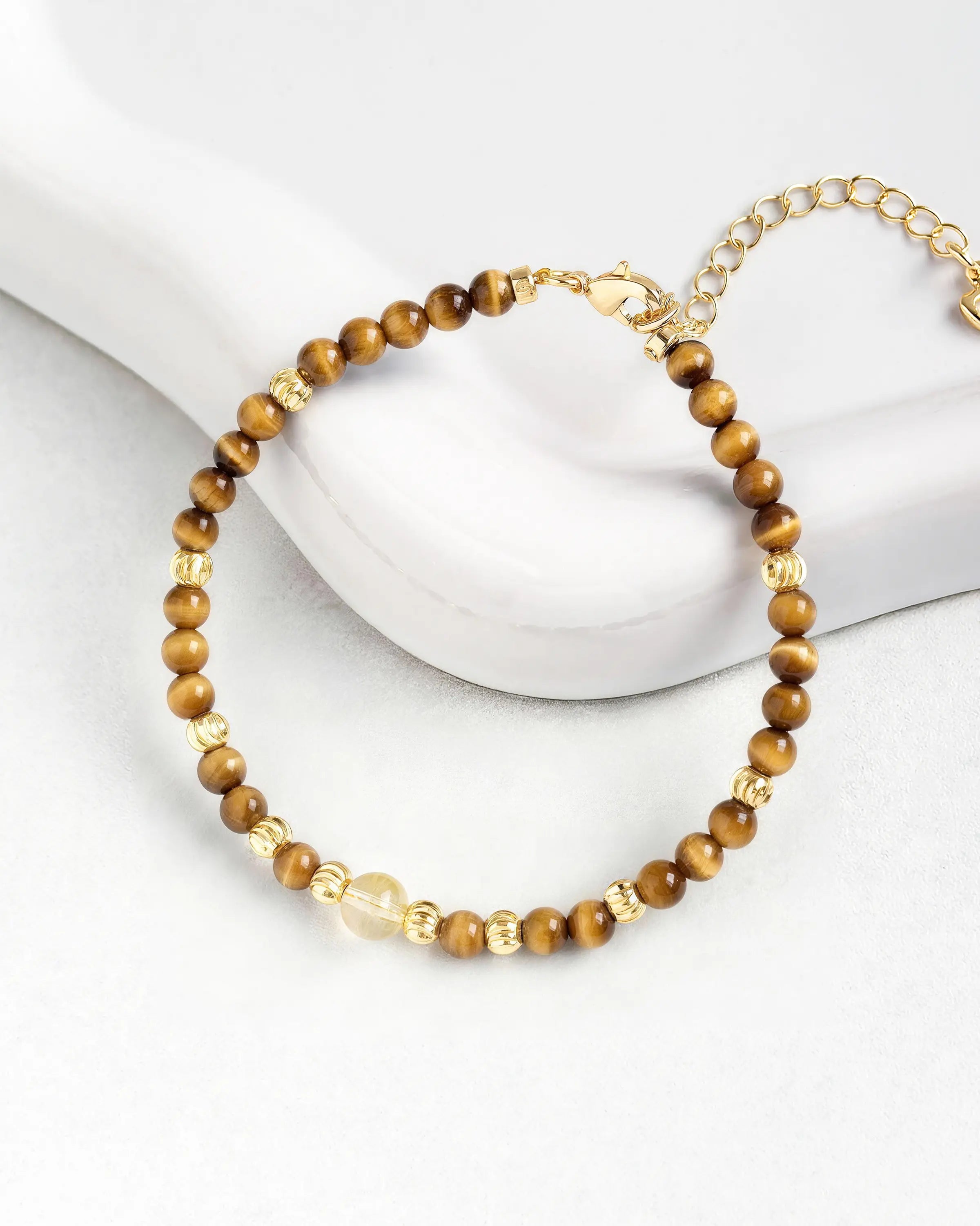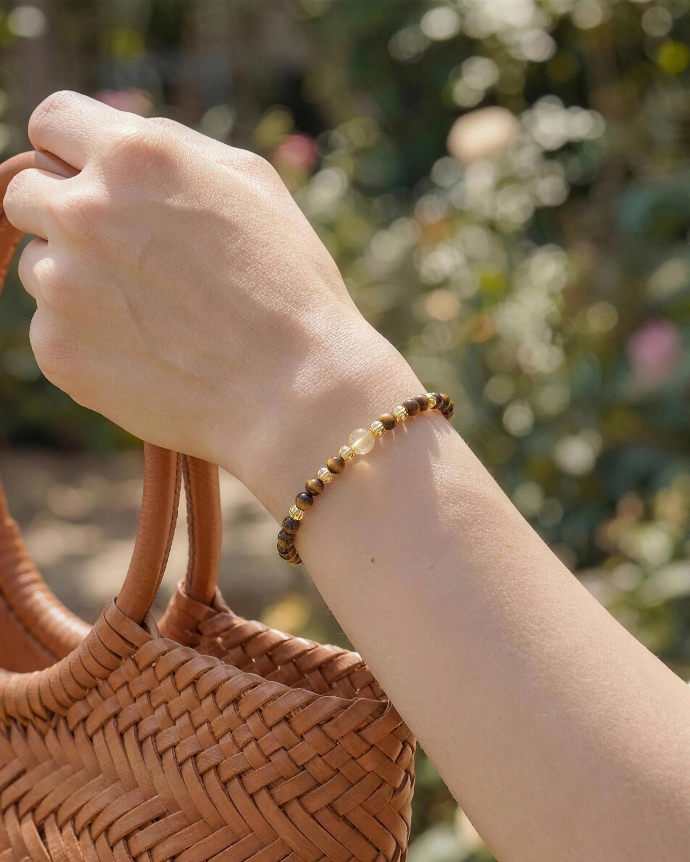 This color-block bracelet unites genuine 4mm tiger's eye with fluted 18K gold-plated brass spacers, highlighted by a central 6mm citrine, finished with S925 silver details. The bold brown and warm golden hues channel grounded courage and a shield against negativity. Wear this powerful partner daily to foster persistent strength.
