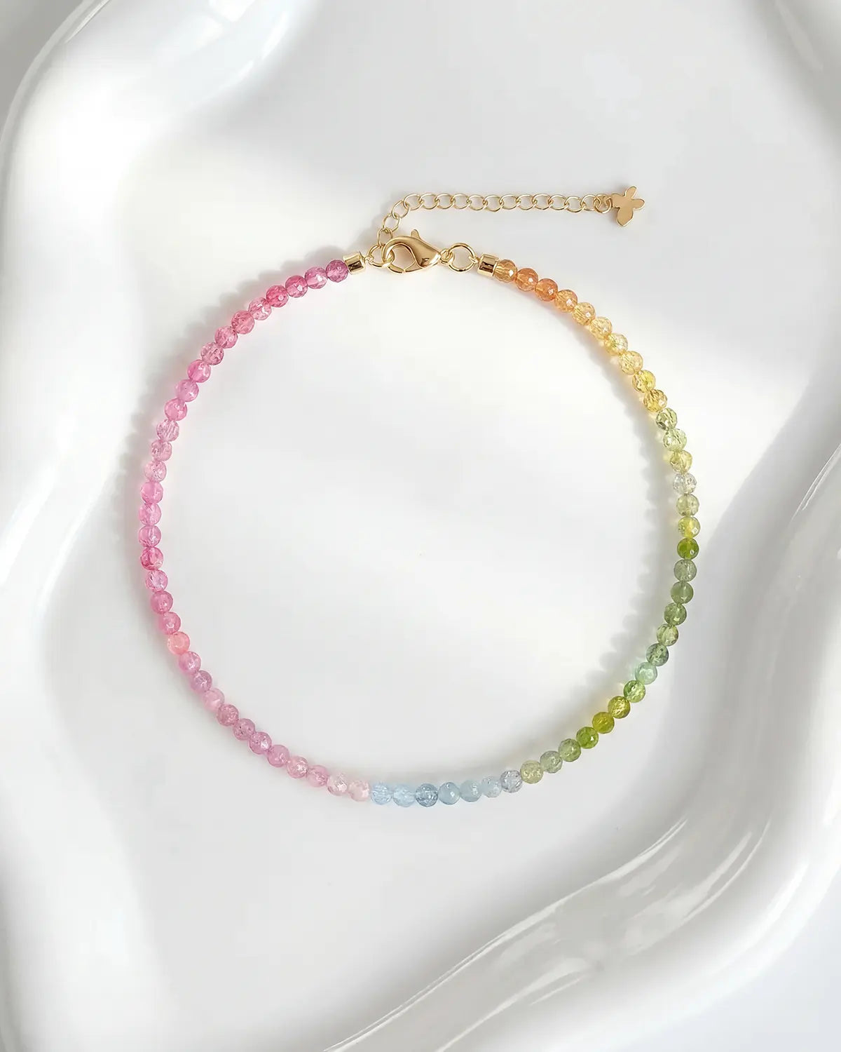 Inspired by a sunlit butterfly garden, this 18K gold-plated bracelet features multi-colored pink tourmaline beads in a playful rainbow arrangement.