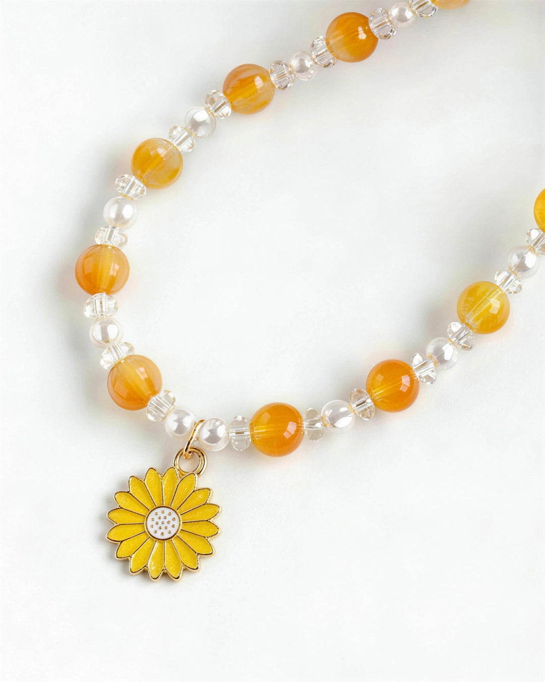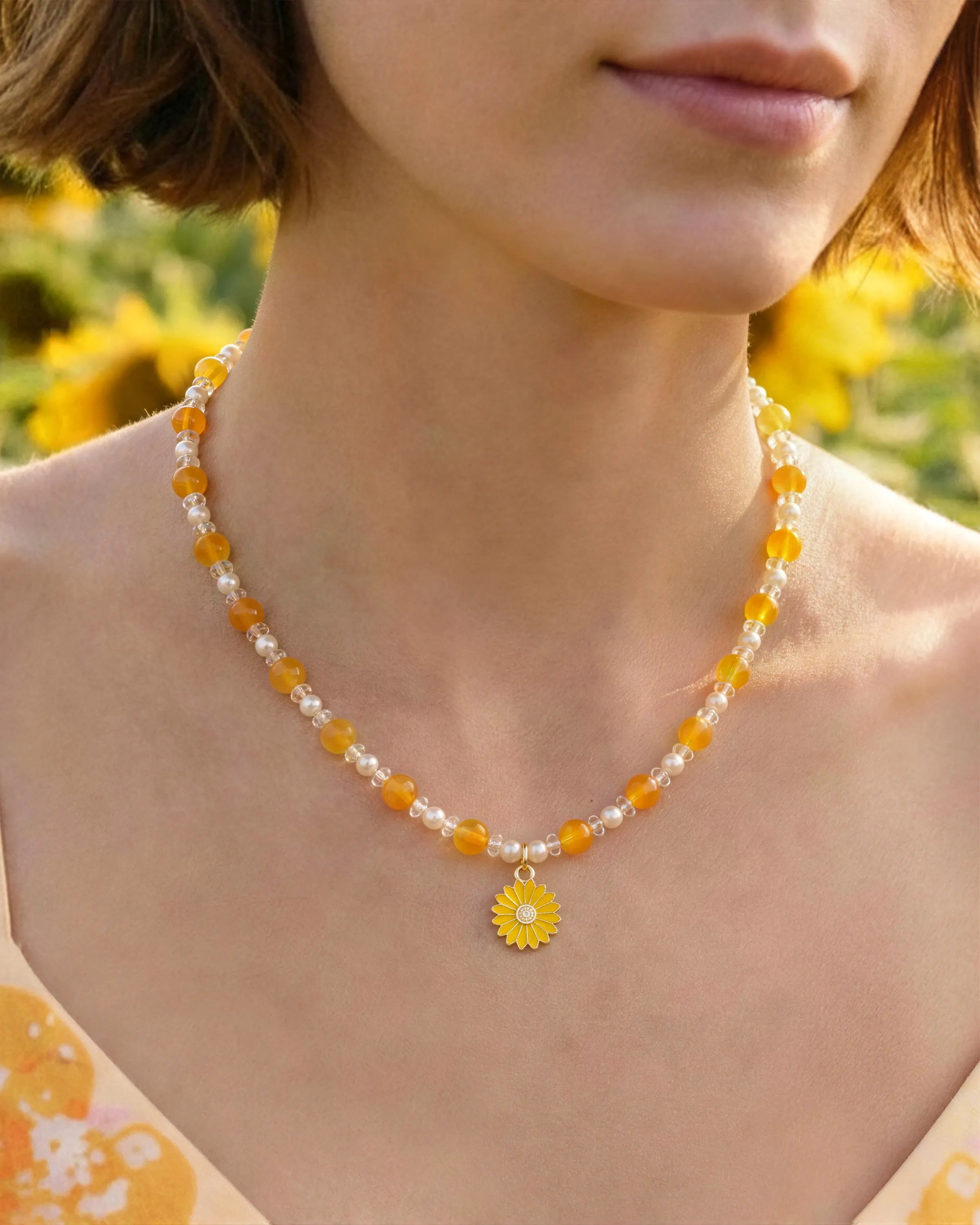A whisper of cheer from a wild meadow. This necklace interweaves radiant 6mm Yellow Jade with diamond-cut Clear Quartz and delicate Mother-of-Pearl, catching the light like sunbeams on dewy grass. The artistic Meadow Daisy pendant—a symbol of innocence and loyal love—rests as a tiny, wearable sun. Wear it to invite happiness into your routine, adding a bright, effortless glow to your summer dress or a crisp afternoon look.